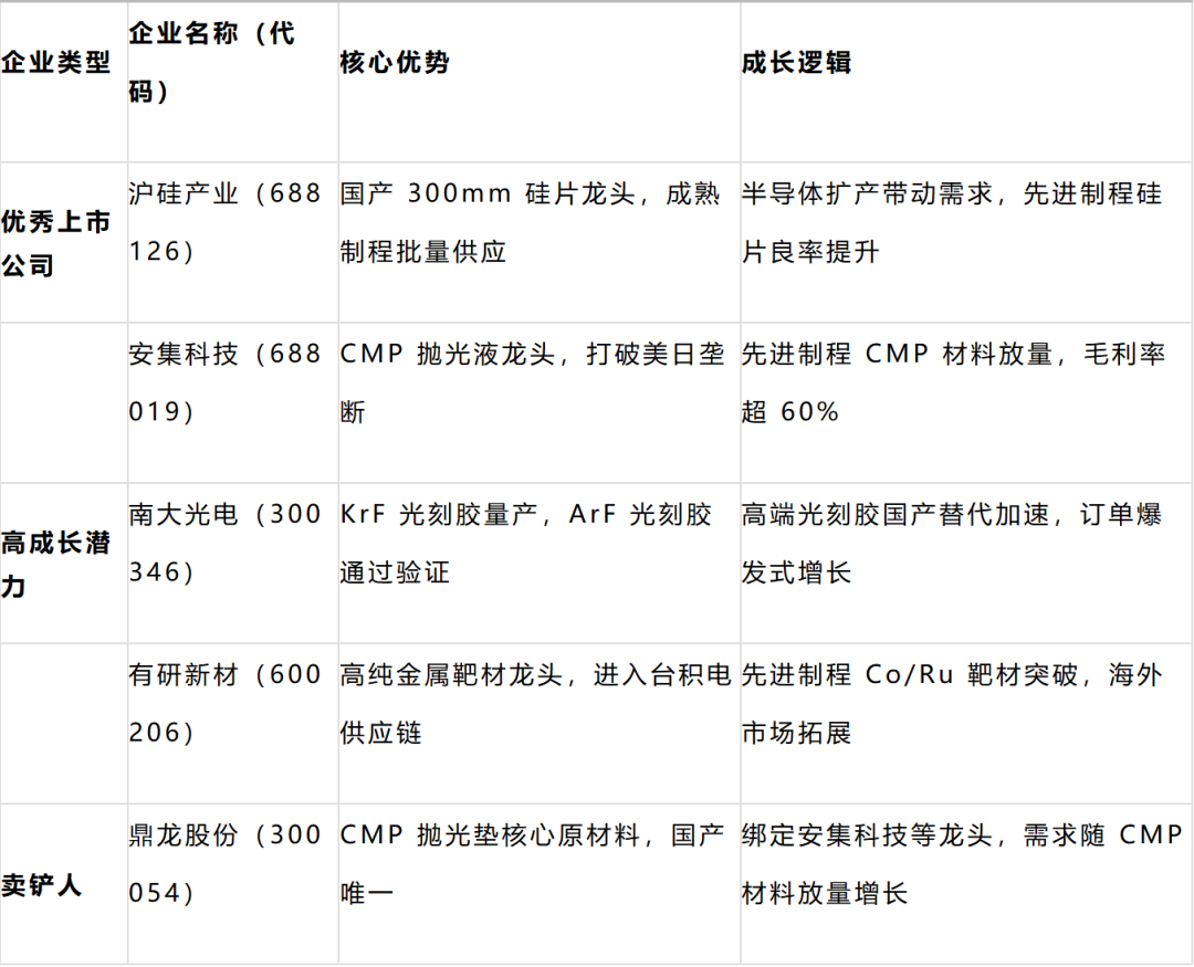 300mm 大尺寸硅片、ArFi/EUV 光刻胶及配套试剂、高纯电子特气、CMP 抛光材料、Co/Ru 高纯靶材、3DIC 先进封装材料。