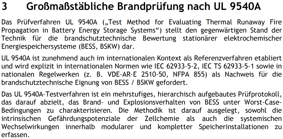 该协会发布的《技术性防火规范——电池储能装置》(Technische Richtlinie Vorbeugender Brandschutz BATTERIESPEICHERANLAGEN)为容量超过100千瓦时的固定式电池储能系统(BESS)或电池储能电站(BSKW)制定了统一的消防最低标准。