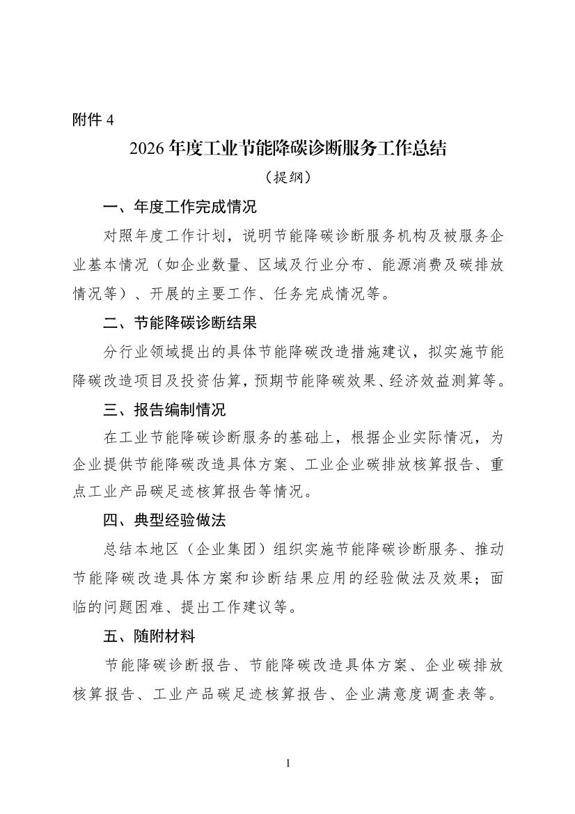 (四)报送工作总结。请推荐单位从诊断数量、完成质量、数据分析、方案编制、企业反馈等方面对工业节能降碳诊断服务工作进行总结,于2026年12月15日前形成年度工作总结报告(见附件4)报送工业和信息化部(节能与综合利用司)。