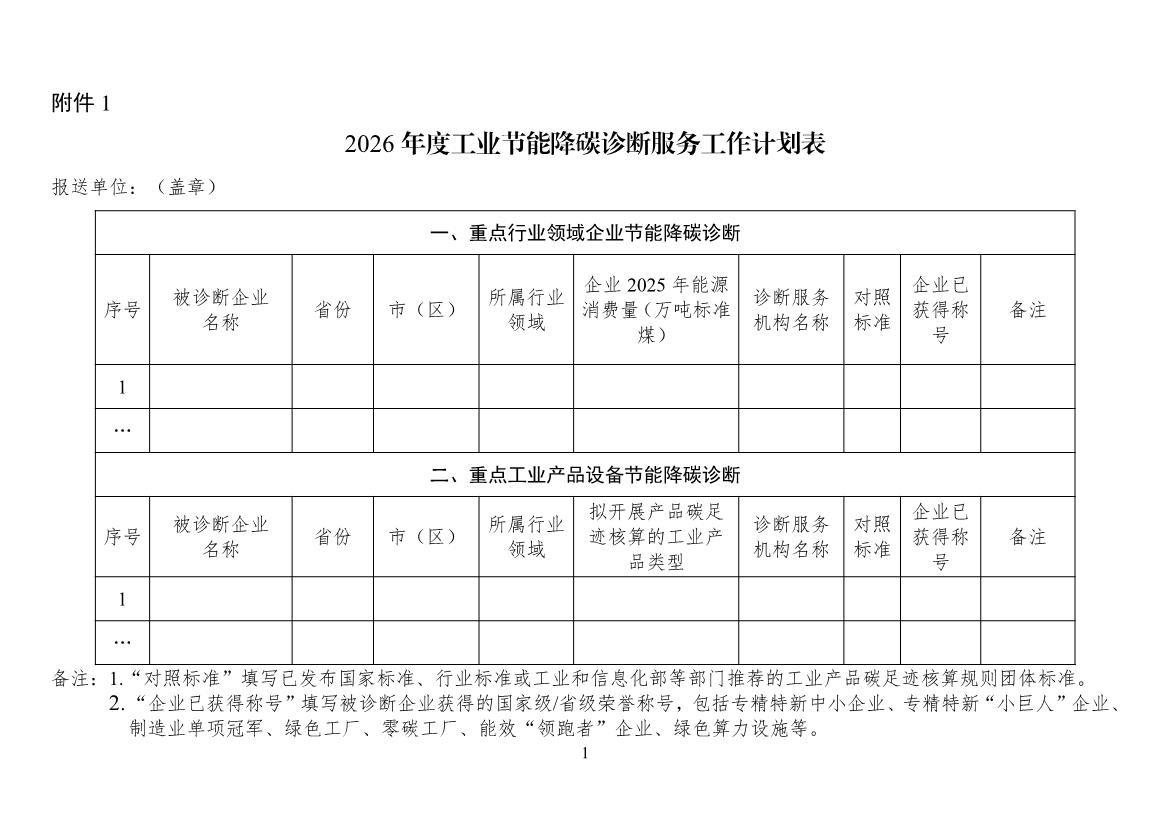 为贯彻落实国务院办公厅《制造业绿色低碳发展行动方案(2025—2027年)》,积极推行“诊断+咨询”服务工作体系,进一步提升工业节能降碳诊断服务水平,推动重点行业领域节能降碳,现组织开展2026年度工业节能降碳诊断服务工作。有关事项通知如下: